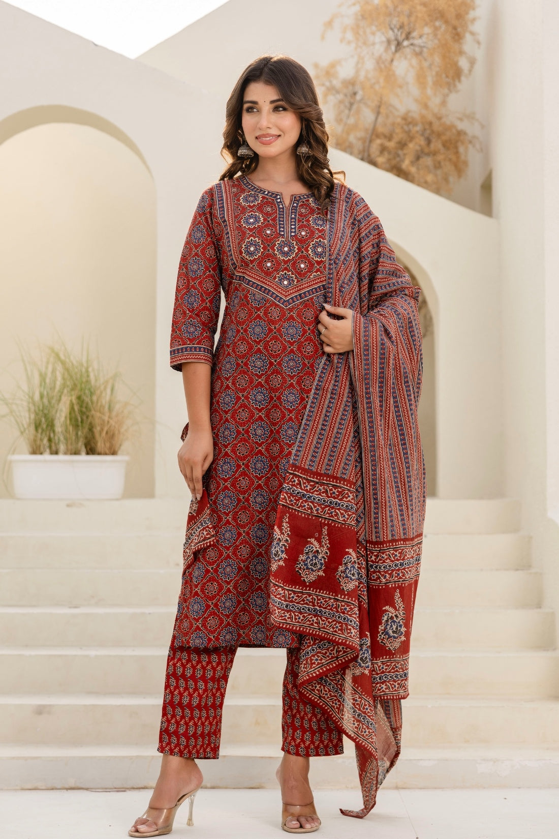 3. Red Ajrakh Print Cotton Kurta Set with Palazzo Pants