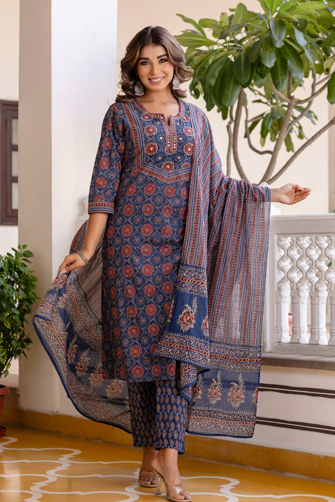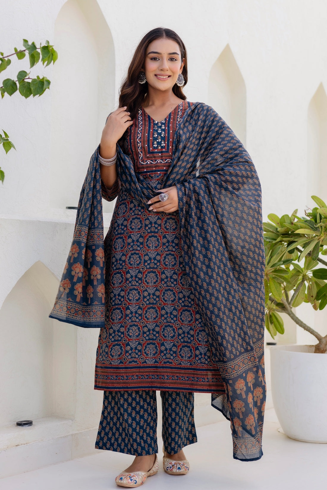 1. Dark Blue Ajrakh Print Yoke Design Kurta Set