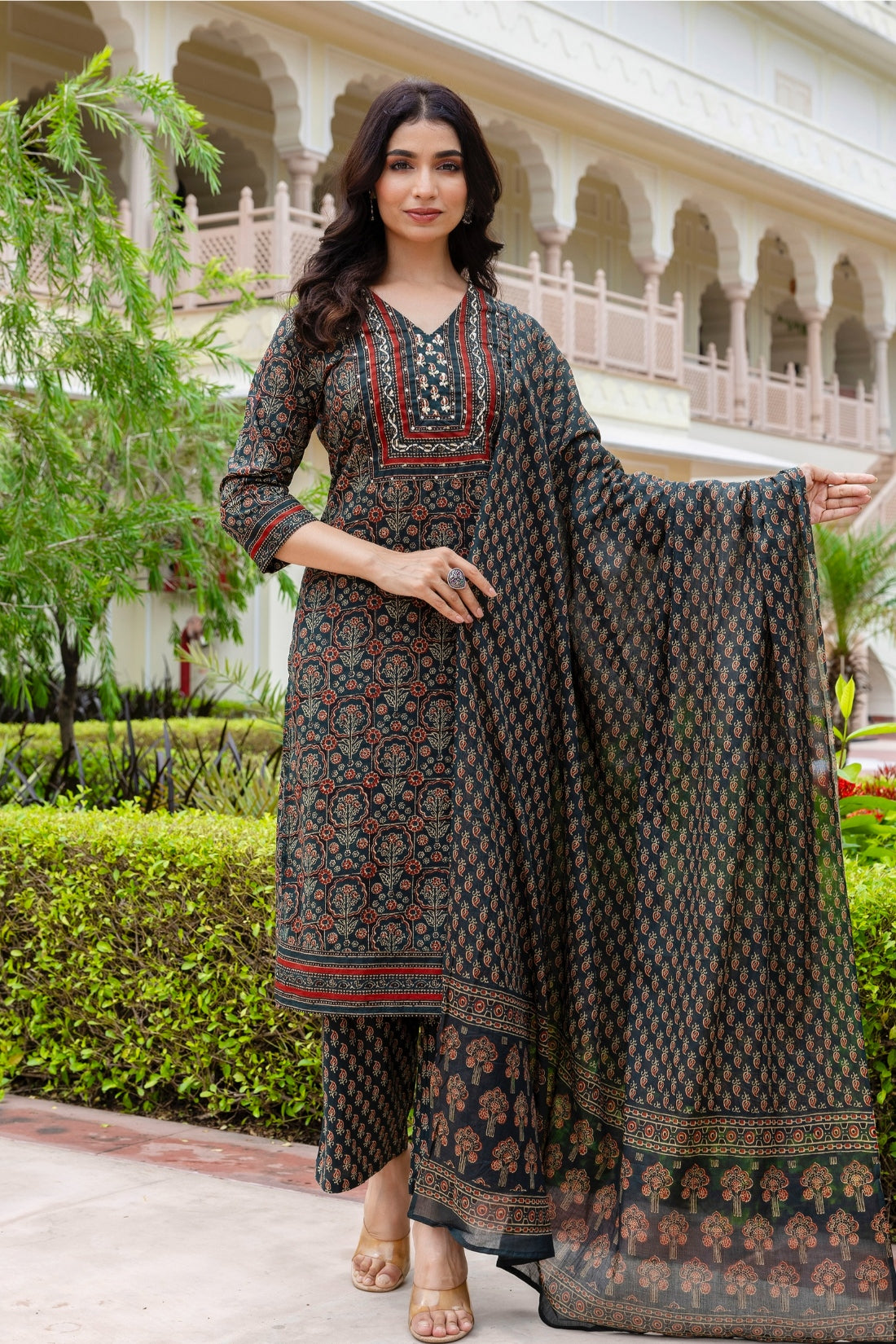 2. Dark Green Ajrakh Print Yoke Design Kurta Set